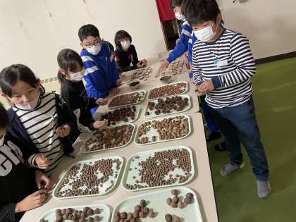 様々な木の実を使って、置物を作りました。自然の家の方に木の実の名前を尋ねながら選び、思い思いの作品を作ることができました。