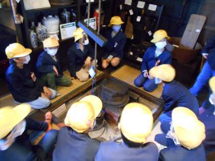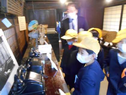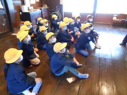 民俗資料館での様子です。昔の電話を見て、今の電話との違いに驚いていました。みんなで囲炉裏を囲んで、昔のくらしを疑似体験してみました。