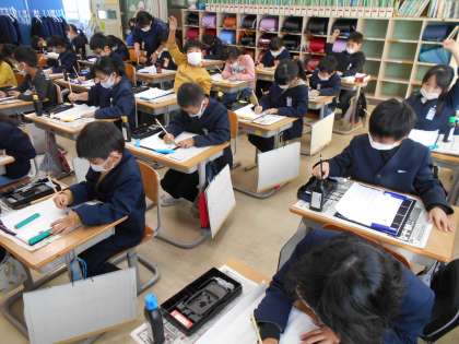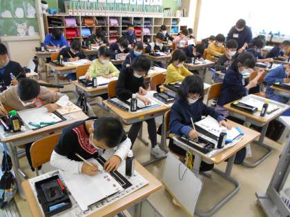 書写の学習では、小筆を使って名前を書く練習をしました。初めて小筆を使う子供がほとんどで、始めは筆に含ませる墨の量や持ち方に戸惑っている様子が見られました。何度も練習して、最後には自分の名前を上手に書くことができました。
