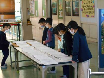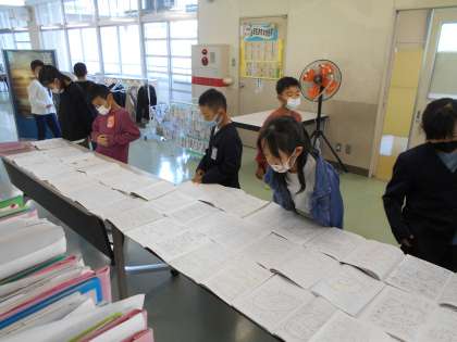 今日は、3年生と6年生で、自主学習ノートを見合う「自学デー」を行いました。子供たちは、6年生の自主学習ノートをじっくり見ていました。教室に戻ってきて、「色を使ってまとめていたよ」「ノートにぎっしり書いていてすごい」と話していました。6年生のノートを参考に、やる気を高めている様子の子供たちでした。