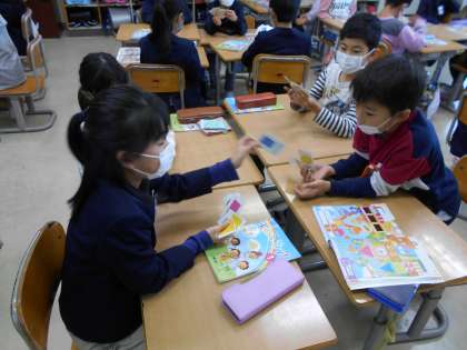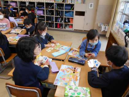外国語活動では、友達に欲しいものを尋ねる言い方を学習しました。形のカードを使い、友達に“What do you want?”と質問しながら同じカードをそろえるゲームをしました。カードを相手に渡すときの言い方や、カードをもらったときのお礼の言葉まで、友達と英語で伝え合っていました。ゲームを通して、楽しく活動することができました。