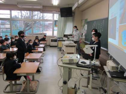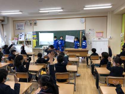 地球温暖化をとめる取組への協力を呼びかけました。聞いている子供たちが質問や感想を話す姿もありました。