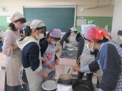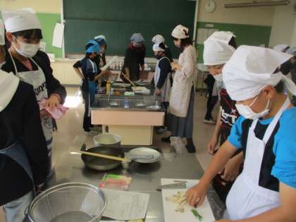 昨日に引き続き、1・4・5組が野菜のベーコン巻きをつくりました。トントンとリズミカルに聞こえてくる包丁の音。1学期や夏休み期間中には、課題として家庭でおかずづくりをしているので、その成果も出ているのかもしれません。
