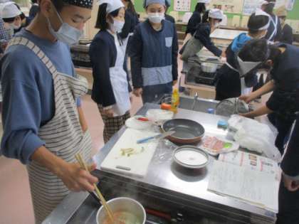 この調理実習の写真は、各クラスで調理を開始した1時間後に撮っており、どのクラスでも、同じ工程での写真が多いです。どのクラスでも、調理計画通りに活動を進める力を付けてきています。