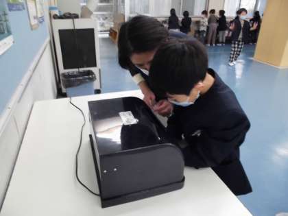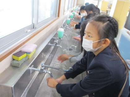 学級活動「手をきれいにあらおう」を行いました。養護教諭から手洗いの必要性や手洗いのこつ等を教えてもらった後、手洗いチェックローションを使用し、洗い残しがないかを実際にチェッカーで確認しました。子供たちは、指の先、指の間、手の平のしわ等に洗い残しがあることに気付き、何度も手を洗い直していました。これからは、しっかりと手洗いをしていきたいという気持ちを高めました。