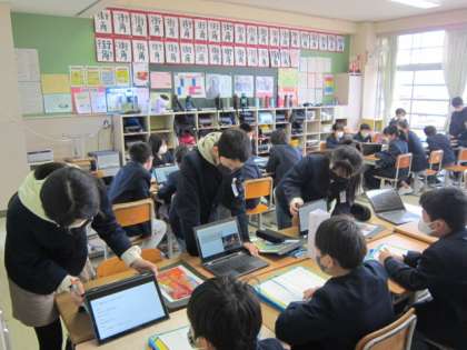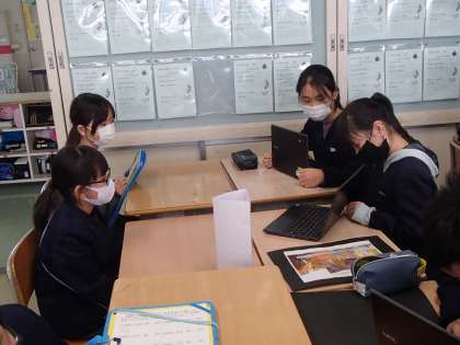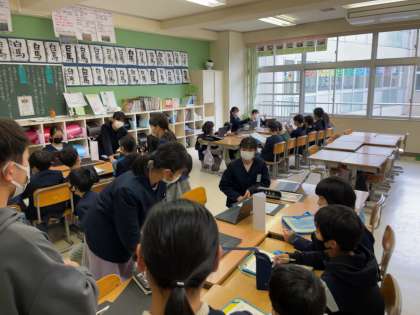 6年生が総合的な学習の時間で調べた富山の魅力について、発表を聞きました。工夫をこらしたスライドやポスターに、興味津々な様子でした。