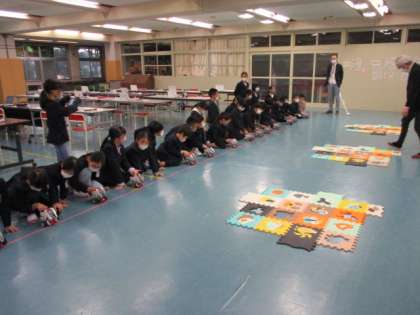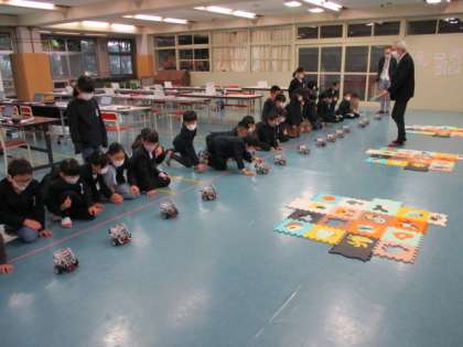 今日は、3、4組のプログラミング学習を行いました。講師の先生から、ロボットへの簡単な指令の送り方を教わり、ロボットを動かしました。みんなでスタート!「動いた!」「すごい!」と喜ぶ子供たちでした。向きを変えられることも教わり、ミッションに向けてやる気になってきました。