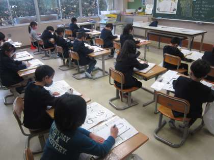 さて、今日は書き初め大会がありました。練習のときから、「1.大きく2.強く3.左手は紙を押さえる4.名前も作品」を大切にがんばってきました。「金賞をとるんだ」といった熱い気持ちで取り組みながらも、静かに集中して丁寧に書くことができました。