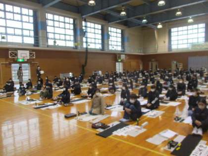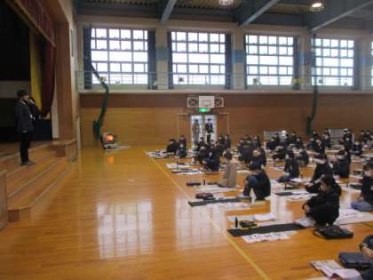 第3学期始業式が終わり、6年生は体育館で書き初めを行いました。