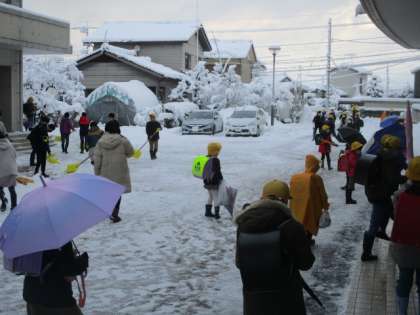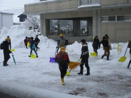 昨日から降り続いた雪の影響で、本校玄関前も雪が積もりました。登校した6年生たちが、ランドセルを多目的ホールに置き、除雪作業をしました。除雪で積み上げた雪の多さが、子供たちのがんばりを表しています。