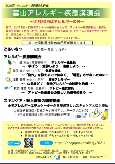 アレルギー疾患講演会のご案内 公開日 2022/01/28 更新日 2022/01/28 保健室から 上記の通り、オンラインにてアレルギー疾患講習会が開催されます。 興味関心のある方はぜひご参加ください。