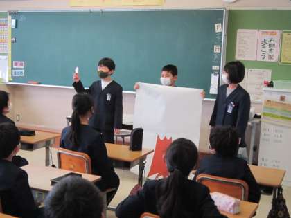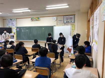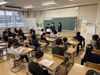 6年生さんの卒業をお祝いするために、4年生で桜のメッセージの台紙を作りました。できたものを代表児童が1〜5年生さんに届けに行きました。