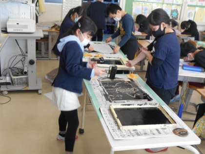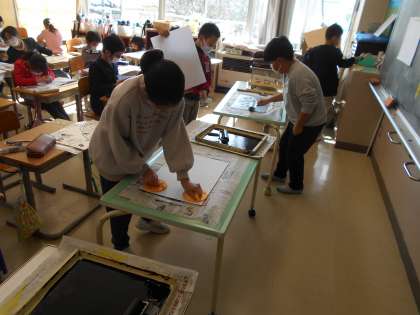 先週からスチレンボードに絵を写しとる活動に取り組みました。今週は、いよいよ紙に刷る活動に挑戦しました。スチレンボードの端までインクが付いているかをしっかり確認しながら慎重に刷ることができました。刷り上がった作品を見て嬉しそうな子供たちでした。
