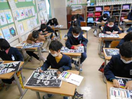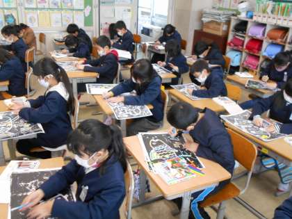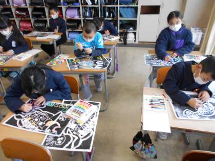 刷り上がった版画に着色をしました。にじ色の魚のうろこや模様、周りの様子が分かるように工夫して色を塗り進めました。色鮮やかな「にじ色のさかな」の世界が完成し、うれしそうな子供たちでした。
