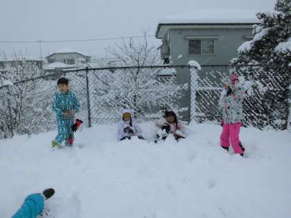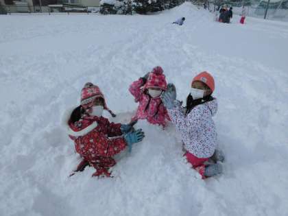 昨日、雪遊びを行いました。待ちに待った積雪。朝から子供たちは、どきどきわくわくが止まりませんでした。築山でごろごろ転がったり、雪だるまをつくったりしました。ふかふかの雪の中を歩くだけ、寝転がるだけでも楽しくて、子供たちは十分に雪を楽しむことができました。雪遊び用具の準備にご協力くださりありがとうございました。