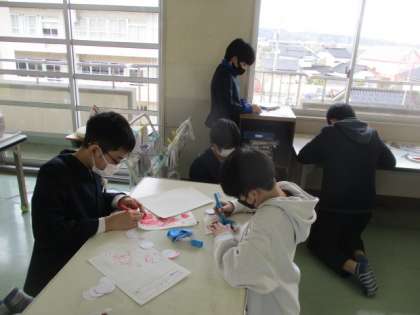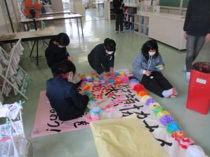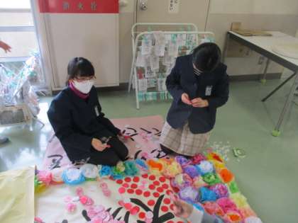 卒業を2週間後に控え、6年生の各クラスでは卒業プロジェクトを進めています。その一環で、本校体育館に掲げていた鵜坂っ子のスローガンを直したり、花紙で花を作って飾ったりしました。