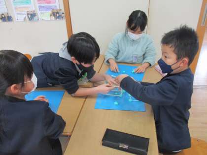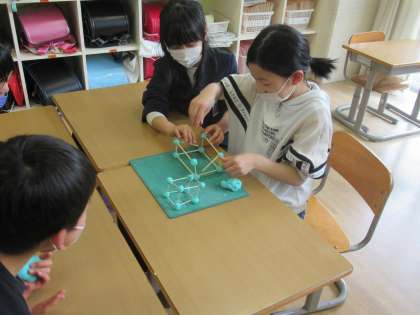 今日は、辺の部分はひご、頂点の部分は粘土を使って2種類の箱の形を作りました。向かい合う辺の長さが同じであることや、1つの粘土(頂点)から3本のひご(辺)が出ていることに気付いていました。