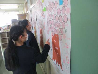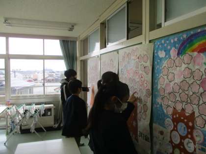 6年生の各教室の壁に各学年からのお祝いメッセージ付きの桜の木が掲示してあり、子供たちは、メッセージをうれしそうに読んでいました。