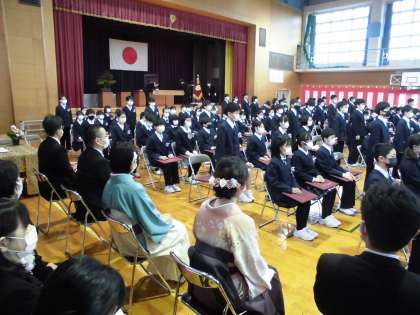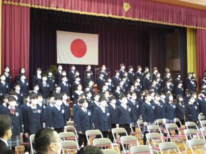 卒業生の呼びかけと歌の場面では、練習の成果を発揮して、決意の込もった声と心を1つにしたきれいな歌声を体育館に響かせていました。