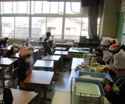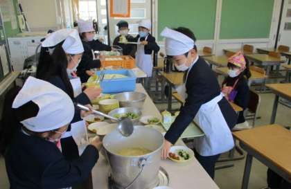 給食の初日の様子です。 みんなで役割を分担しながら、準備を進めています。