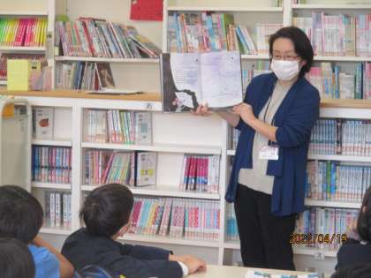 2年生に進級し、今日は図書室の使い方をもう一度学習し、図書室のどの棚にどんな本があるのかを確かめました。読み聞かせもしていだだきました。今後もたくさんの本と出会い、心豊かな子供たちなってほしいと思います。