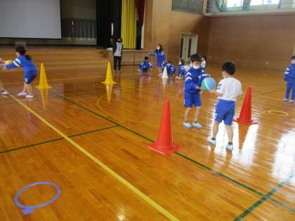 子供たちは、運動会に向けて元気いっぱい練習をしています。50M走では、腕を振り、前を見て真っ直ぐ走ることを意識して力一杯走っています。また、団体競技に向けて協力する気持ちを高めようと、ボール運びを行いました。「右から行こうよ」と2人で協力したり、「がんばれ」と仲間を応援したり、みんなで声を掛け合う姿が見られました。運動会がとても楽しみです。