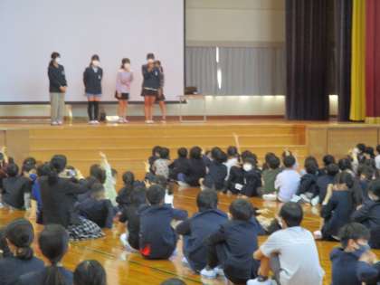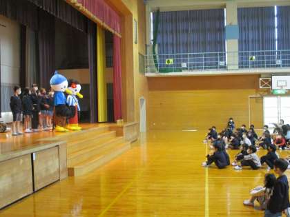 まずは、鵜坂小学校での学校生活のきまりやマスコットがいることを1年生に伝えました。