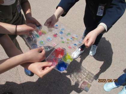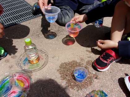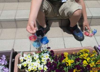 昨日と打ってかわって今日はとてもよい天気でした。2年生は、昨日図工でつくった「光のプレゼント」の作品を持って外に出ました。太陽の光を生かして、友達と重ねたり、水を入れてみたり、花の色を変身させたりして楽しみました。