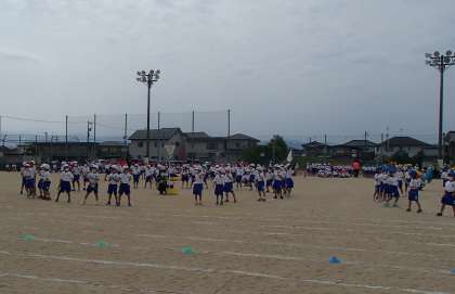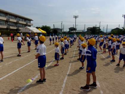 運動会予行を行いました。4年生、6年生と一緒に開会式や準備体操をしたり、歌を歌ったりし、運動会本番のようなの雰囲気を感じることができました。