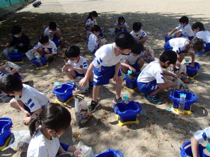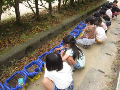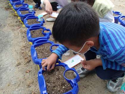 子供たちは、土や肥料を植木鉢に入れ、一粒一粒丁寧に種を植えました。