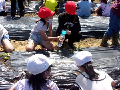 地域の方に協力を得て、サツマイモの苗を植えました。異学年交流として、2年生と協力しながら行いました。2年生に優しく声をかけながら、作業する5年生の姿が見られました。