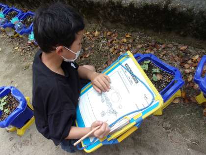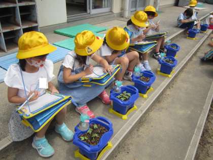 生活科の学習で育てているあさがおが芽を出しました。自分のあさがおの色や形をじっくりと観察していました。