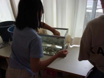 メダカを飼うときに気を付けること等を調べ、自分たちで水槽の準備も行いました。
