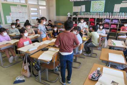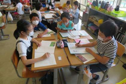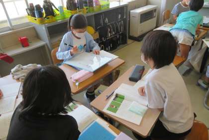 国語科の「アップとルーズで伝える」の学習では、前の学習を生かして、全文を「初め」「中」「終わり」の三つに分ける活動をしました。まず、一人一人で考え、それを基にグループ、全体で話し合いました。接続詞や内容を根拠に、構成を考えることができました。