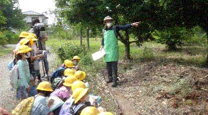 このゾーンではカブトムシの幼虫を育てており、成虫が好む樹液を出す木がたくさん植えられています。子供たちは、生き物と自然のつながりを学習していました。