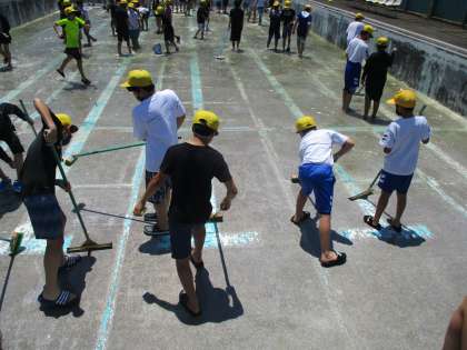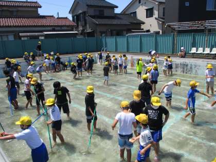 排水後にプールの底の部分をブラシやたわしを使ってきれいにしました。