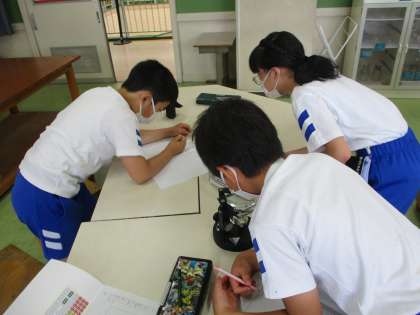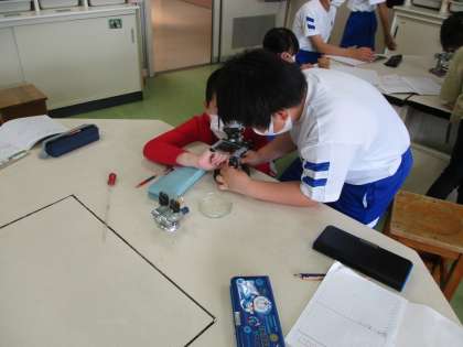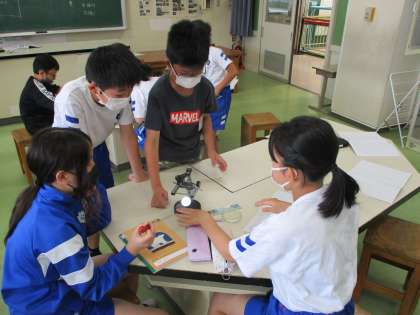 5年生が大切に育てているメダカが卵を産みました。理科の学習でメダカの卵を観察し、気付いたことを話し合いました。