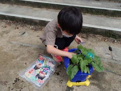 雨の日以外は、水やりをしています。本葉が出て、背も伸びてきました。クラスによっては、子供たちと話し合いながら、追肥をしたり、一部を植え替えをしたりしています。植え替えするかどうか話し合ったときも、かわいそうだからしないと言っている子供、混み合っていて土が見えないから植え替えることにした子供等、一人一人考えながら育てています。