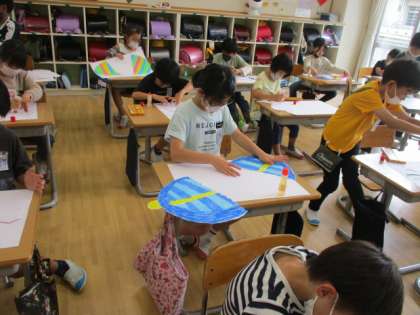 図画工作科「ひみつのたまご」の学習の様子です。自分だけのたまごから何がうまれるか想像を広げて描きました。割れたたまごの中から星や花、生き物やおばけ等、様々なものが飛び出しました。楽しみながら作品を仕上げることができました。