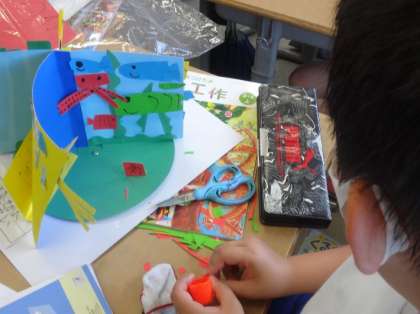 土台が回転する仕組みを使って、いろいろな世界を製作しています。たのしい作品がたくさんできあがりつつあります。完成が楽しみです。