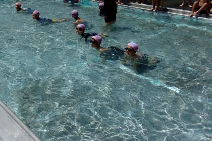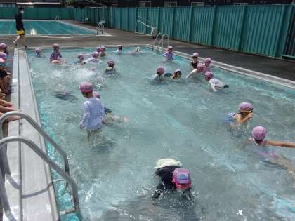 自由遊びの時間には、肩まで浸かったり、バタ足をしたりと思い思いに楽しんでいました。