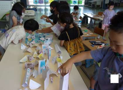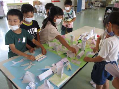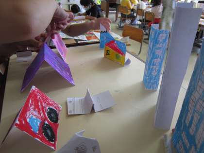 図画工作科「おってたてたら」の学習の様子です。画用紙を使って町にあったらいいなと思う物を想像して作りました。