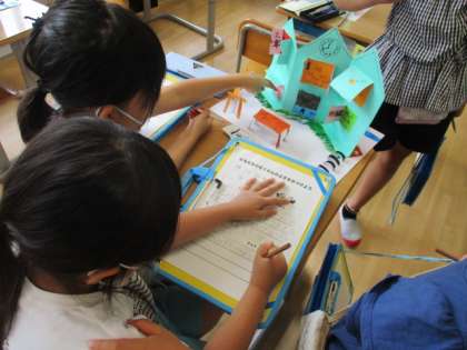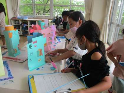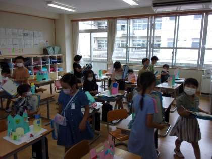 図画工作科「まどからこんにちは」で製作した作品の鑑賞を行いました。窓の形や開き方、建物の模様等の視点から友達の作品のすてきなところをたくさん見付けていました。初めてカッターを使用した作品ですが、すてきな窓がたくさん並び、賑やかな鑑賞となりました。