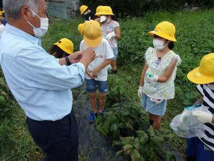 栽培ボランティアの方に質問や相談を終えたあと2年生全員で畑に行きました。子供たちは栽培ボランティアの方と一緒に収穫をし、「今日は7個取ることができた」「前より大きくなったよ」「枯れている葉っぱは取るんだよ」など、教えてくださったことをもとに、自分の悩みや困っていることなどを解決することができてとてもすっきりした顔でした。何個も収穫したり、観察したりする姿に、これからも大切に育てていきたいという気持ちの高まりが感じられました。