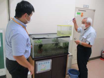 本館1階の多目的ホール横にある水槽に防犯協会の会長さんが持ってきてくださったキタノメダカたちが入りました。子供たちには、理科としての学習だけではなく、生き物に対して愛情をもって育てていくことの大切さについても考えてほしいと思います。