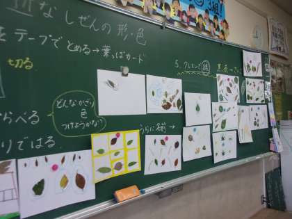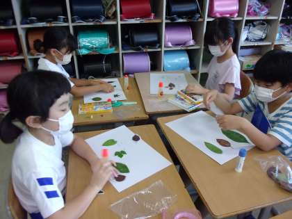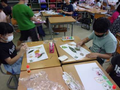 いつも観察している観察池や学校の周りで拾ってきた葉や木の枝などを使った作品をつくりました。