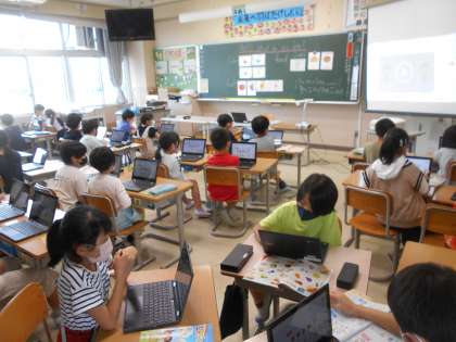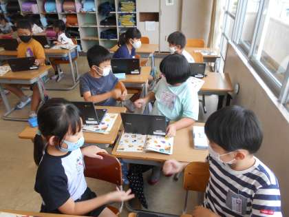 外国語活動の授業でクロムブックを使い、好きなフルーツや色、スポーツについて話し合いました。