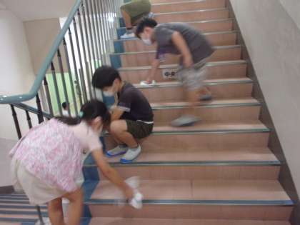 「お客さんが通るところだから、特にきれいにしないと」と職員室につながる階段をすみずみまで清掃する子供たちです。