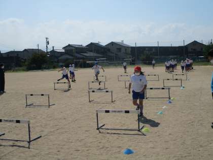 抜き足に気を付けたり、ハードルとハードルの間の距離を選んだりしながら学習に取り組んでいます。