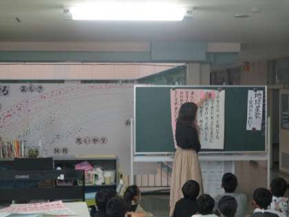 6年生の学習発表会で歌う歌を学年の教員が発表しました。歌詞の内容を想像し、実際に歌を聞きました。学習発表会の内容と歌詞等から感じ取ったことを一人一人が表現できるように練習にしていきます。